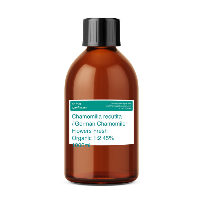 Tincture with a ratio of 1 part fresh Chamomilla recutita to 2 parts liquid. Liquid comprises of 55% water and 45% organic ethanol. Available in 250ml, 500ml and 1000ml amber coloured PET bottles.